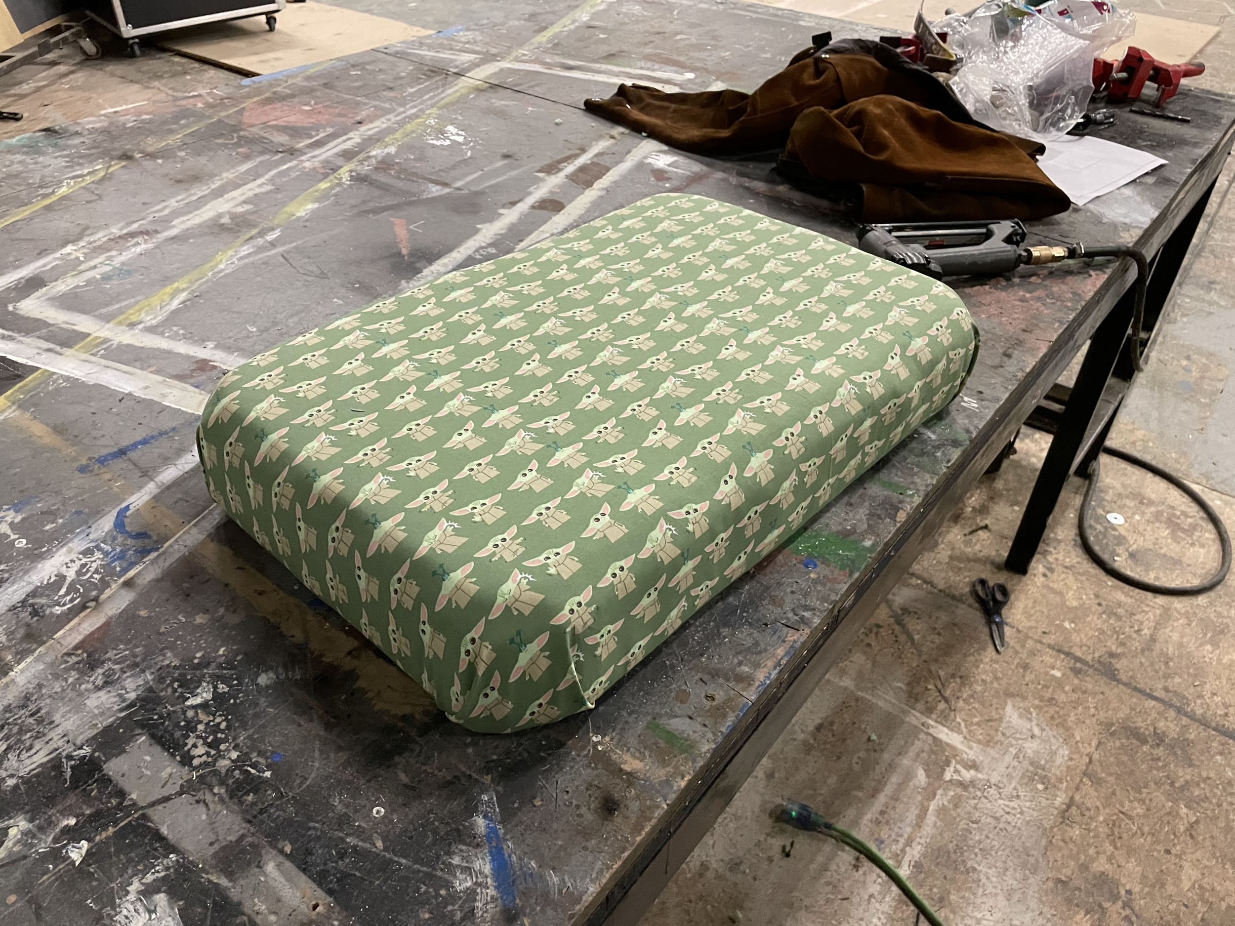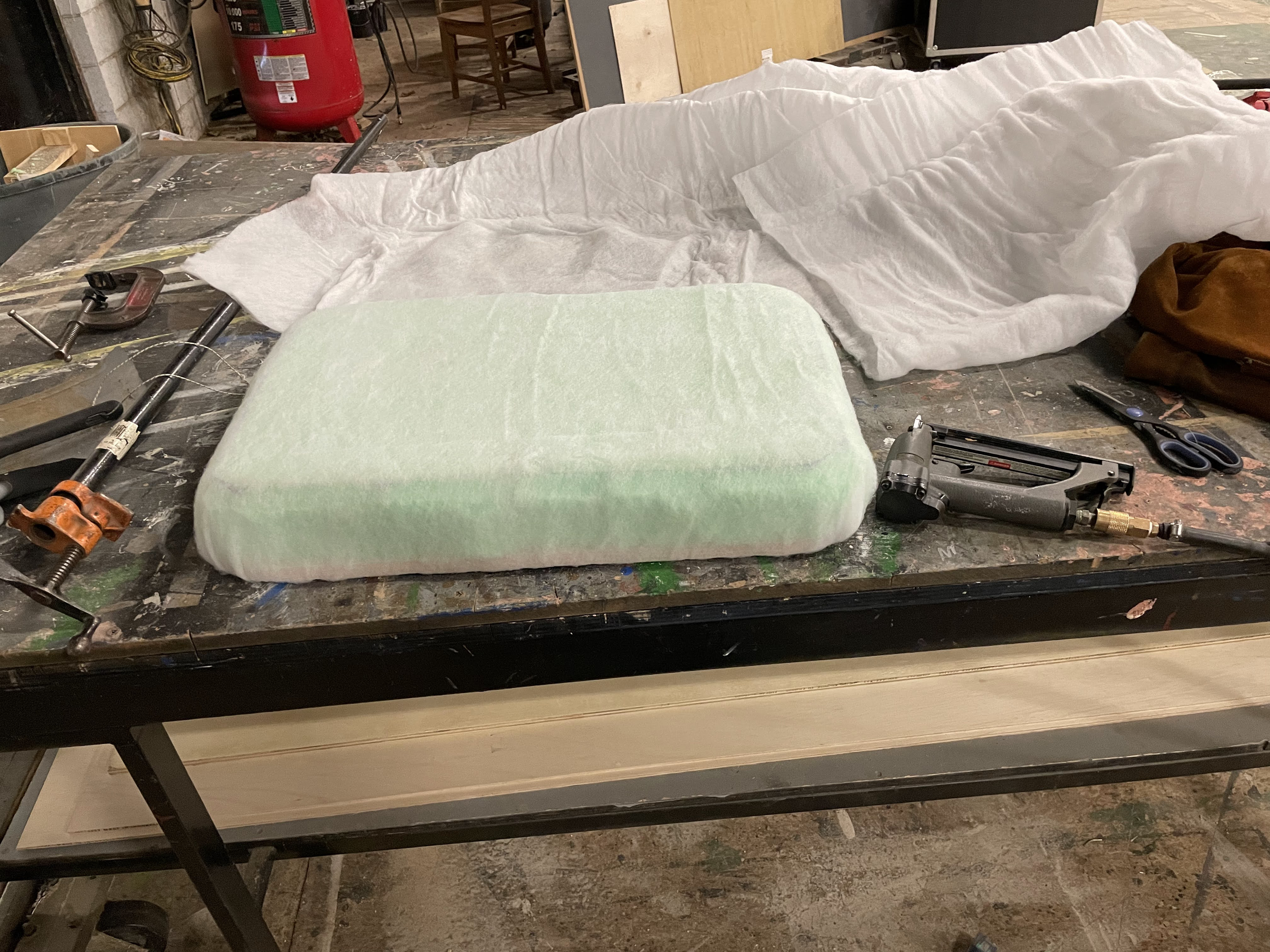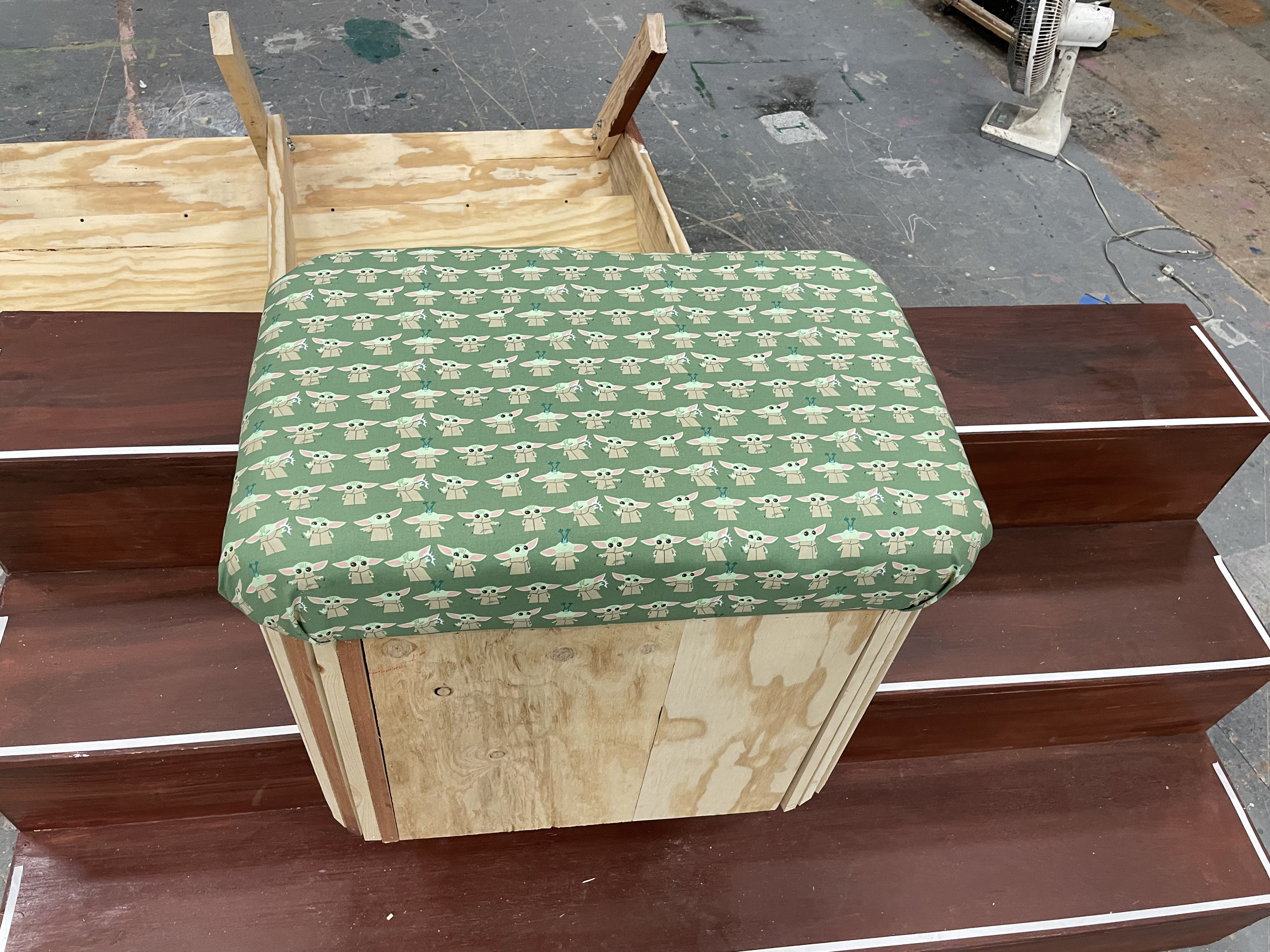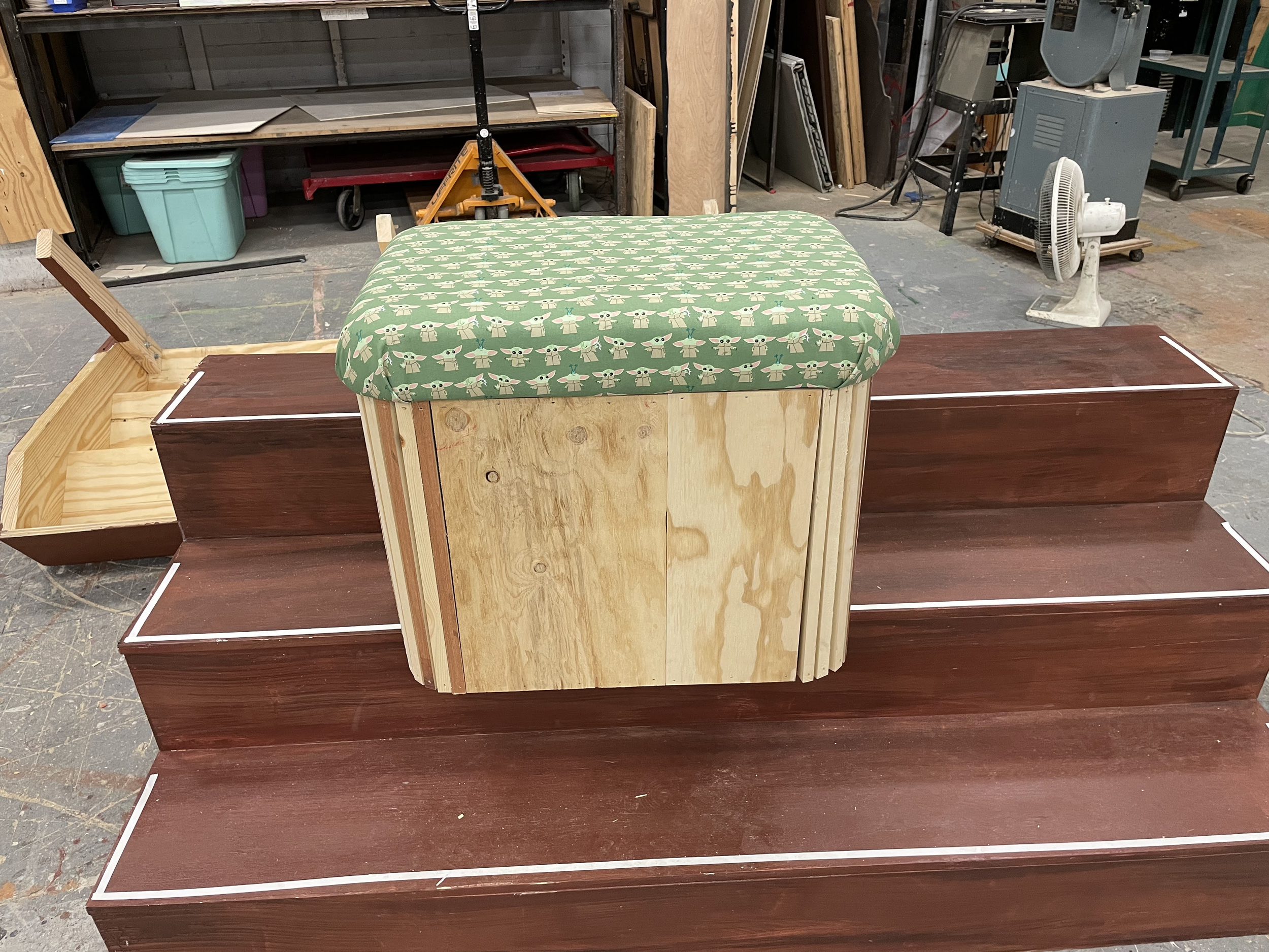 This Ottoman Project was for my Advanced Props Class at Otterbein University. With this project I learned a lot about creating set dressing props for a show. Within this project I learned many skills like barrel staving to create the curved edges around the ottoman, jigsaw the top as well as plunge cut with the jigsaw to create the lid, as well as cushion and upholster the lid of the ottoman and sew together and upholster the base of the ottoman.