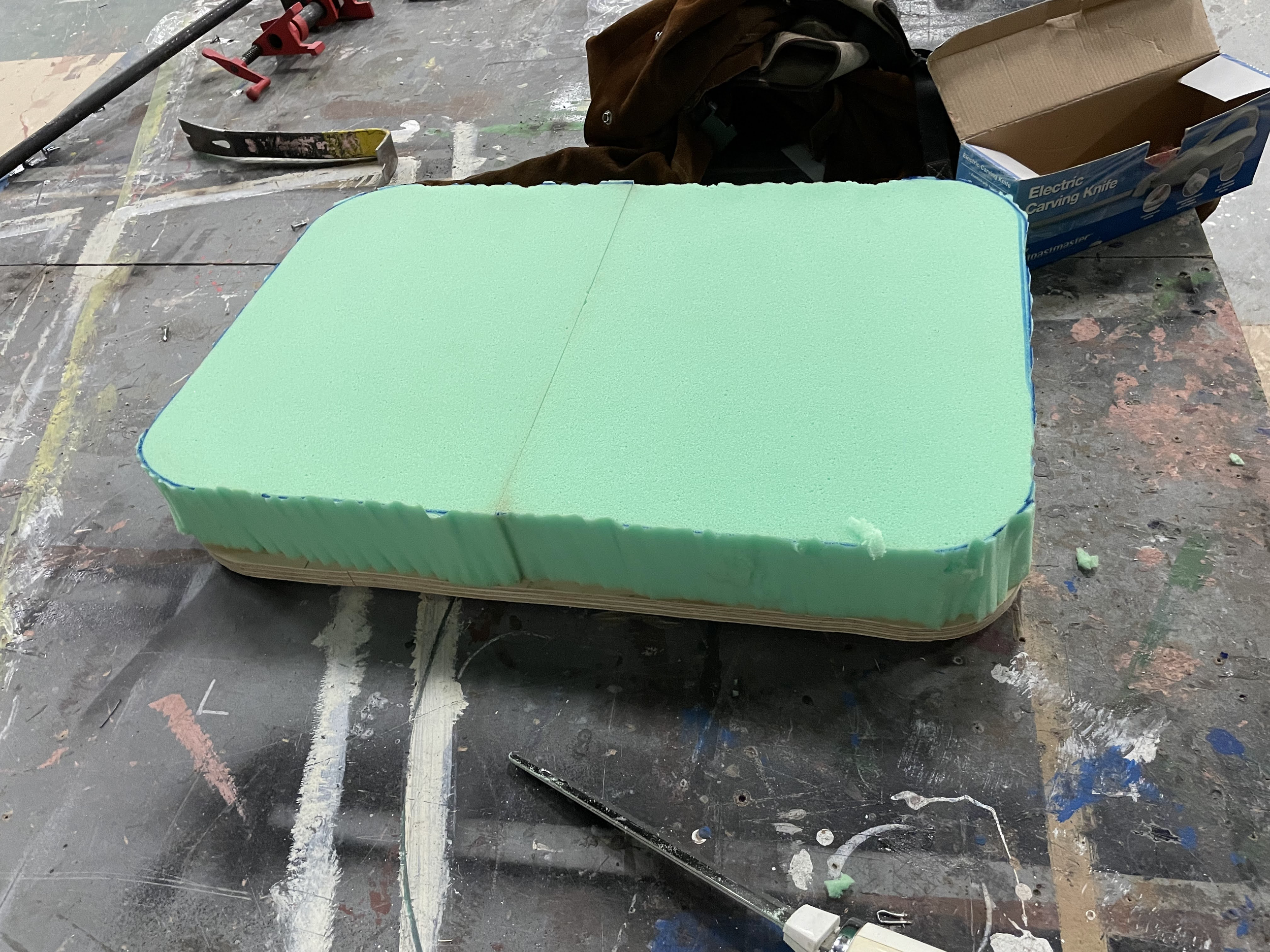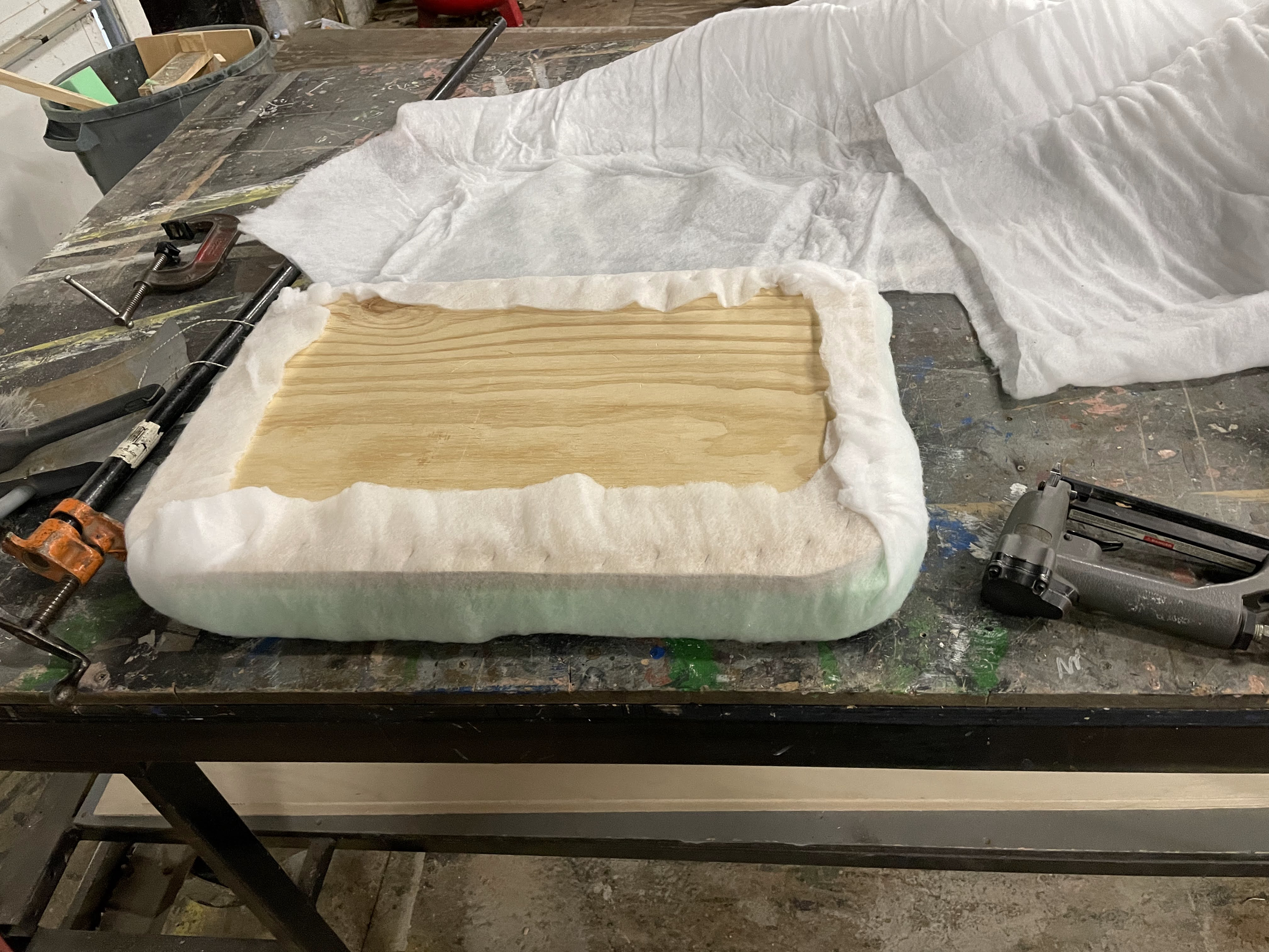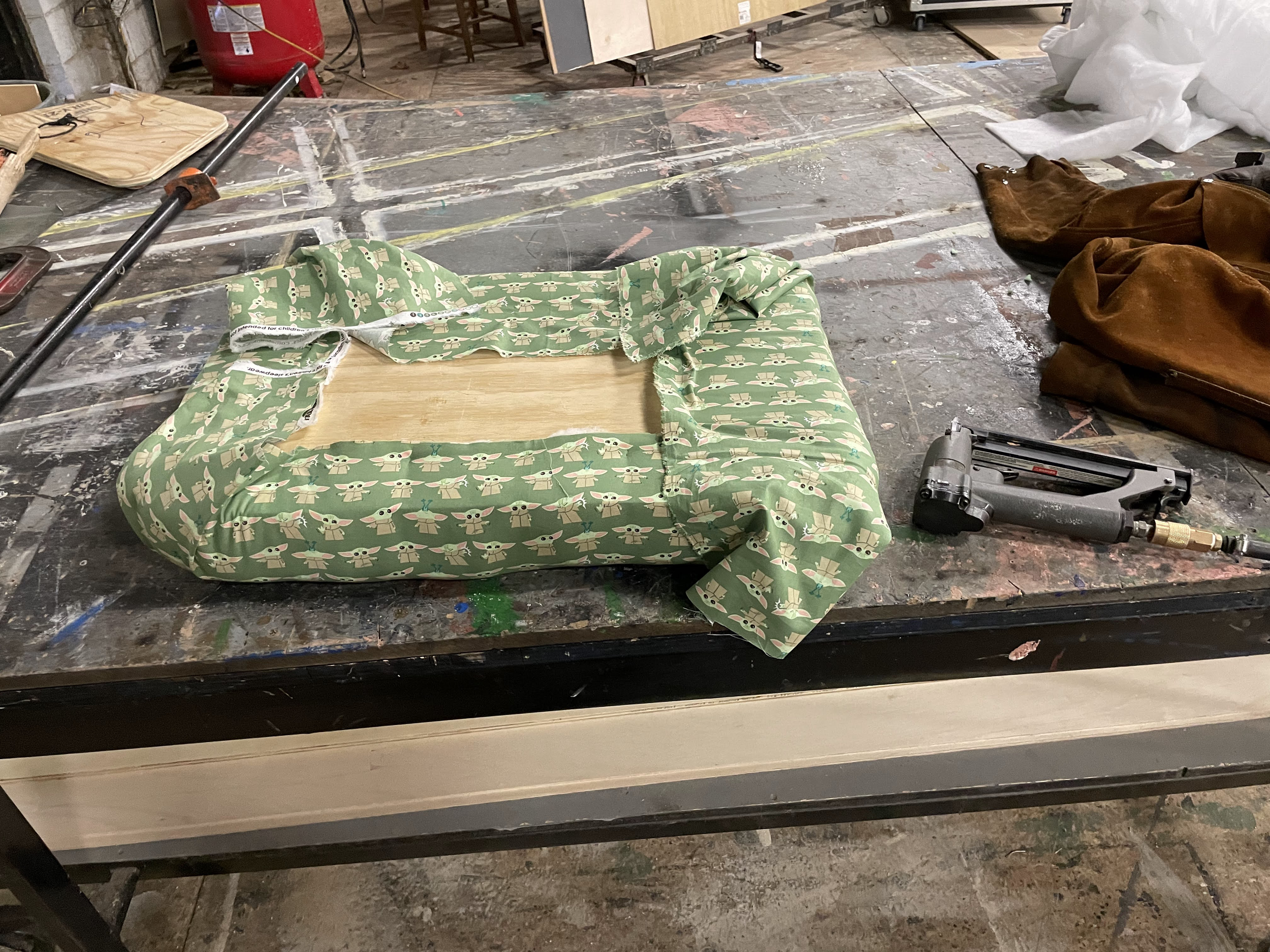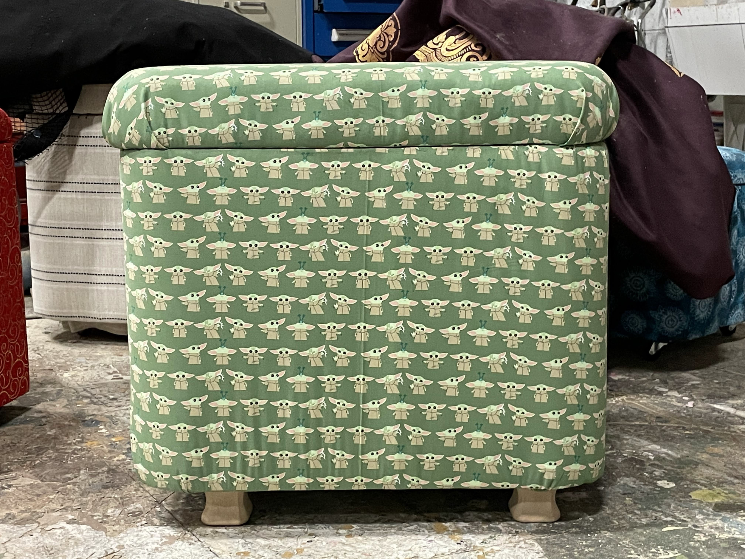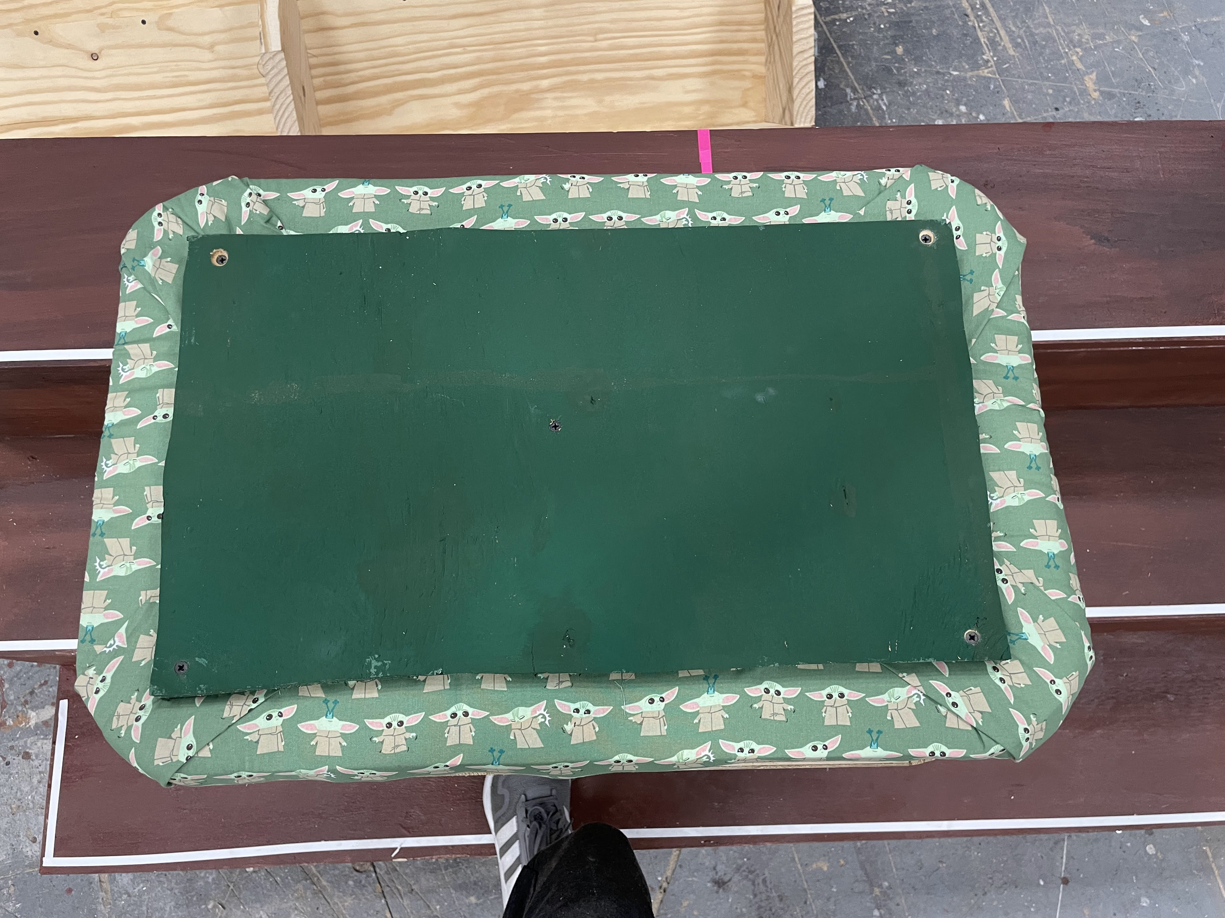 This Ottoman Project was for my Advanced Props Class at Otterbein University. With this project I learned a lot about creating set dressing props for a show. Within this project I learned many skills like barrel staving to create the curved edges around the ottoman, jigsaw the top as well as plunge cut with the jigsaw to create the lid, as well as cushion and upholster the lid of the ottoman and sew together and upholster the base of the ottoman.